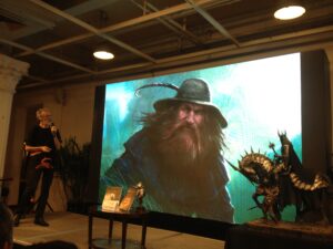 No, there are specialists who do that. You know with something like LOTR you need to befall into the company of people who devote their entire leisure time to studying Elvish writing or Dwarven scripts or languages in Middle Earth or any subject in Middle earth in a totally obsessive way. They are such experts that you really can’t get anywhere, you just ask them what they think. There is no point in trying to do it. I did the map that was on Amazon. We did a big map of Númenor we made two mistakes. I was working with Tom Shippey, a Tolkien scholar, a very solid historian who reads Norse and Icelandic. He is really a serious scholar and actually knew Tolkien. Curiously enough actually met him when he was a student in Oxford when he was a professor in retirement. So Tom worked so hard researching all these elements that we needed to integrate into this map because in the second age Tolkien didn’t really give us a map of the second age. We have a map of Númenor and a map of Middle earth. We have a map of Middle Earth in the third age but it is not the same as in the second age so we spent a lot of time trying to figure out where there were bridges where there were fords where there were roads what they would have been called in what language and we made two mistakes. The map went up on Amazon on Twitter on Instagram and literally probably 20 minutes later somebody was writing a letter to Harper Collins signaling that something was wrong with the map and it is extraordinary, so to have those resources at your fingertips is these people absolutely passionate about it is a real gift. So you want to be really careful with all of that and we made mistakes. If you imagine the map is this big [a meter] we made mistakes where something was this far [a centimeter] from where it should have been and someone spotted it immediately.