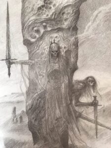 The Barrow-wrights I enjoyed drawing. I regretted that they weren’t in the movies. Peter I think they probably thought of putting them in LOTR. For a while in The Hobbit, there was the idea that they would go thought the Barrow-Downs and something would happen. The location scouts found this marvelous location somewhere in the north island New Zealand extraordinary landscape, but they got written out of the script, so I always wanted to illustrate.