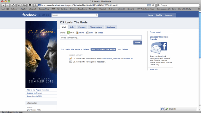 I dnt have a facebook..if i did i would like it straight away…i do apologise for it though….and the film of C.S Lewis sounds exciting…are they releasing it in theaters..hopefully…and since there is a picture of Aslan opposite to the author…is the film also about Lewis’s infleunces on the series…that would be interesting to know..after learning that 4 children came into his home during the war..that was exciting…so yh thanxs for this update David 😉