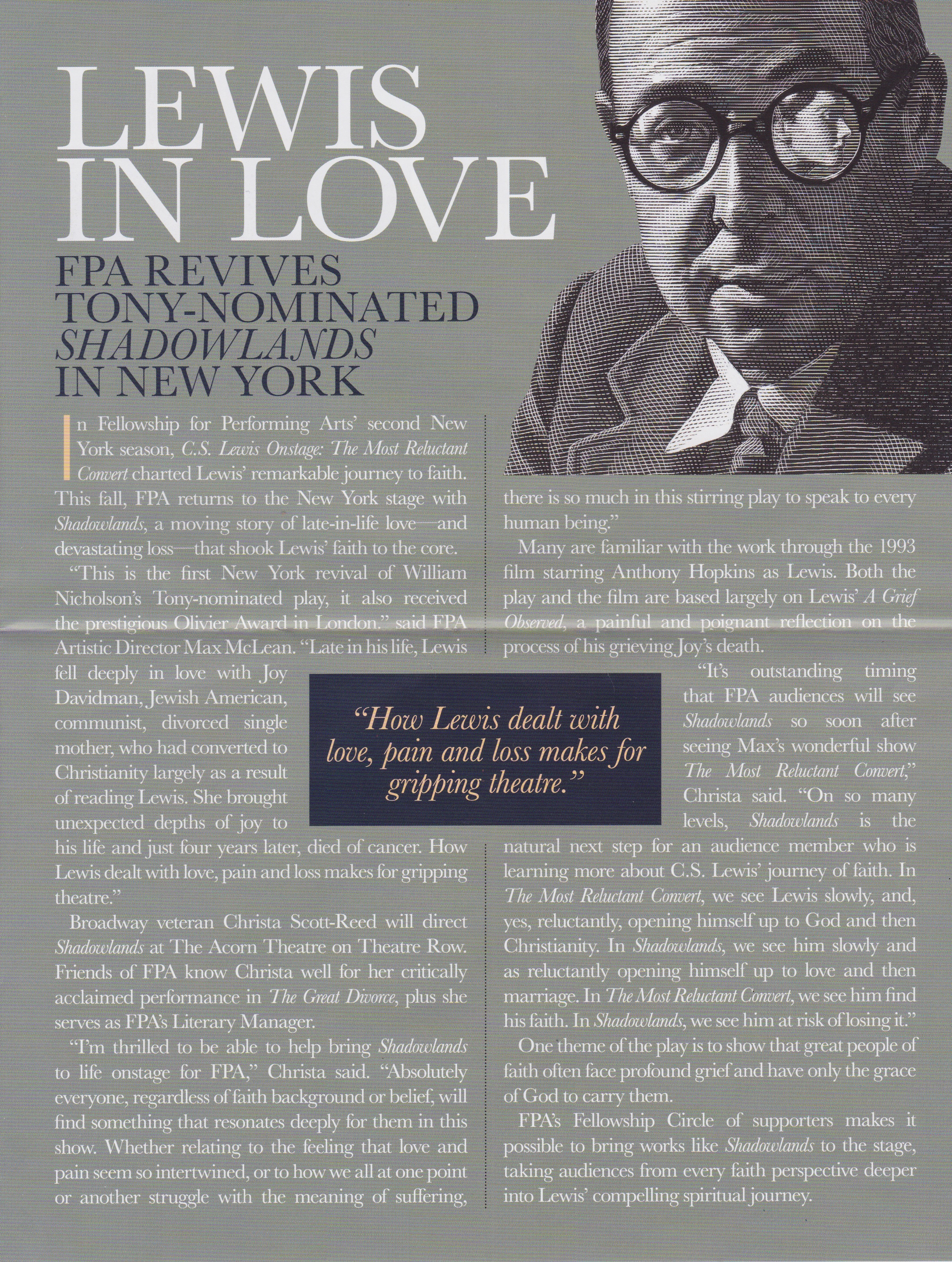 Fellowship for the Performing Arts is currently developing a revival of William Nicholson’s award winning play about the love, life, and loss C.S. Lewis experienced in his relationship with Joy Davidman. This will be the first ever revival of this play which was also the inspiration for a 1993 movie staring Anthony Hopkins. Fellowship for the Performing Arts has produced excellent stage adaptations of C.S. Lewis books The Screwtape Letters and The Great Divorce and is currently touring C.S. Lewis Onstage The Most Reluctant Convert coming to Dallas September 27 – October 8.