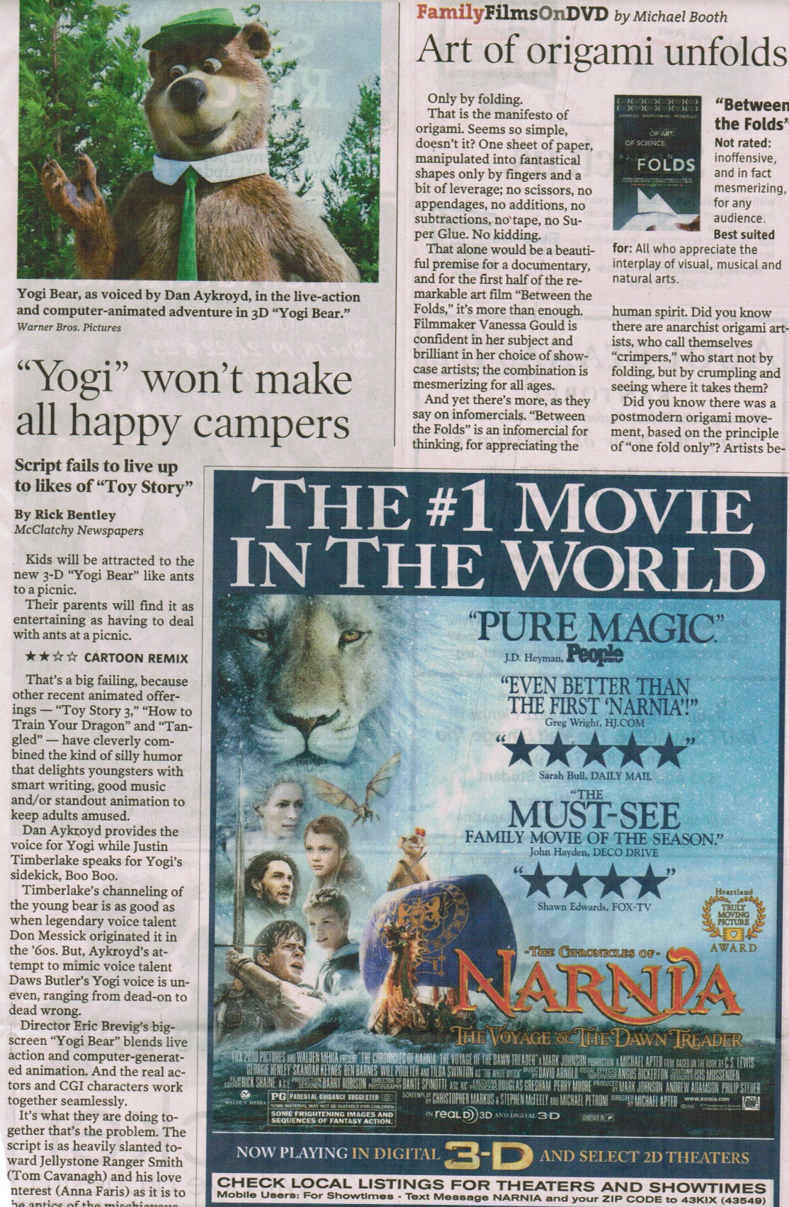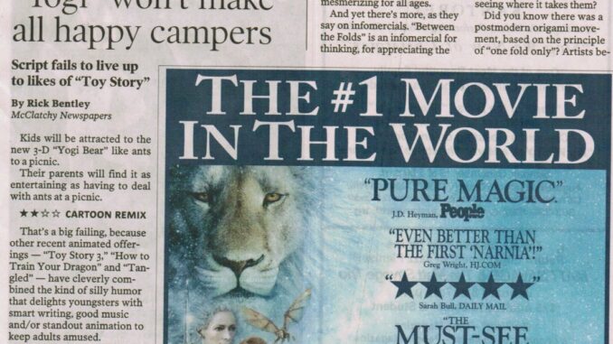 Today I was reading The Denver Post and saw a print advertisement claiming that The Voyage of the Dawn Treader is “The #1 Movie in the World”. This is most likely a reference to the fact that The Voyage of the Dawn Treader opened its first weekend as the #1 movie in box office sales. The advertisement was placed next to a Yogi Bear review by Rick Bentley who gave the film a rating of two stars and said,”Kids will be attracted to the new 3-D ‘Yogi Bear’ like ants to a picnic. Parents will find it as entertaining as having to deal with ants at a picnic.” The Voyage of the Dawn Treader advertisement quoted People Magazine’s review of the film as “Pure Magic” and it also highlighted that the Daily Mail gave it a five star review. At the bottom of the ad it says that mobile users can get showtimes by text messaging NARNIA and their zip code to 43KIX (43549). To view a higher resolution scan of the advertisement click here.
